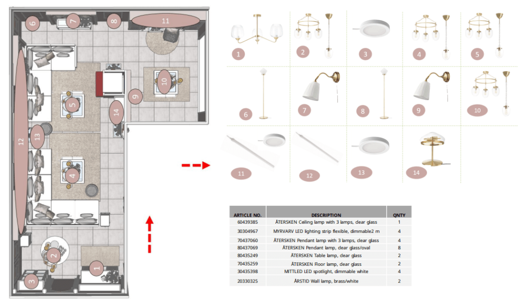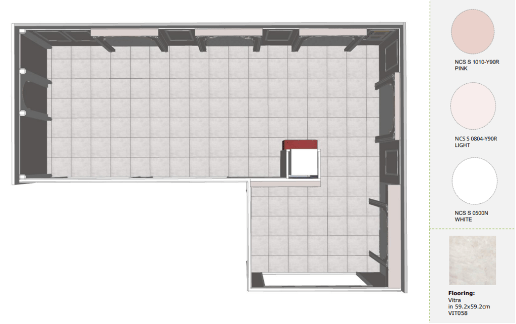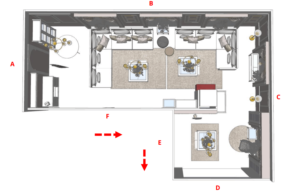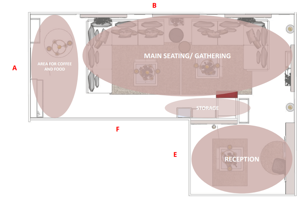 The layout also consists of the main seating area featuring a section to serve food or make coffee/tea and furniture dedicated for storage.