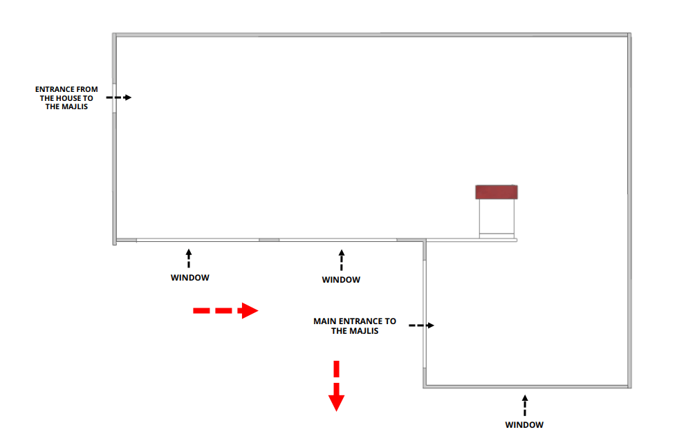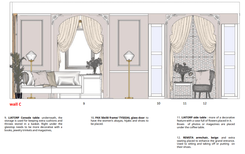 Qatari culture emphasizes a need for privacy when women gather, so the entrance of the majlis has its own reception area where they can hang their abayas and scarfs in a built-in wardrobe.