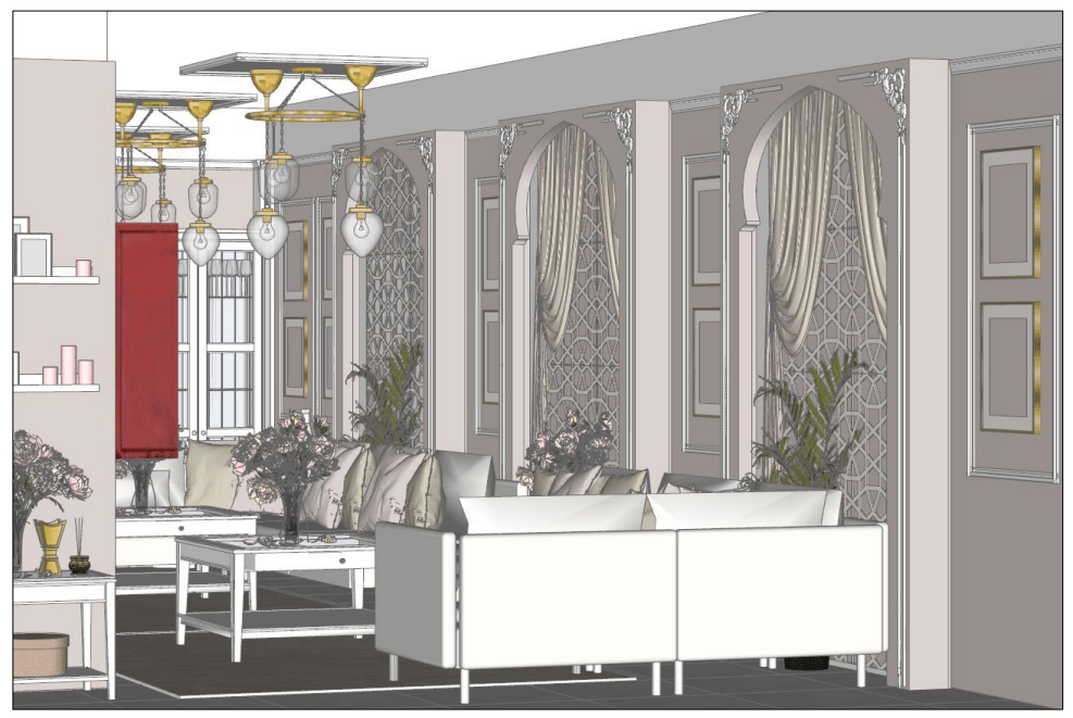 To further enhance the traditional style and feel of the space, I created recessed arch niches around the room with Arabesque geometrical patterns and curtains. Details such as decorative molding on the walls and ceiling were also added around the room.