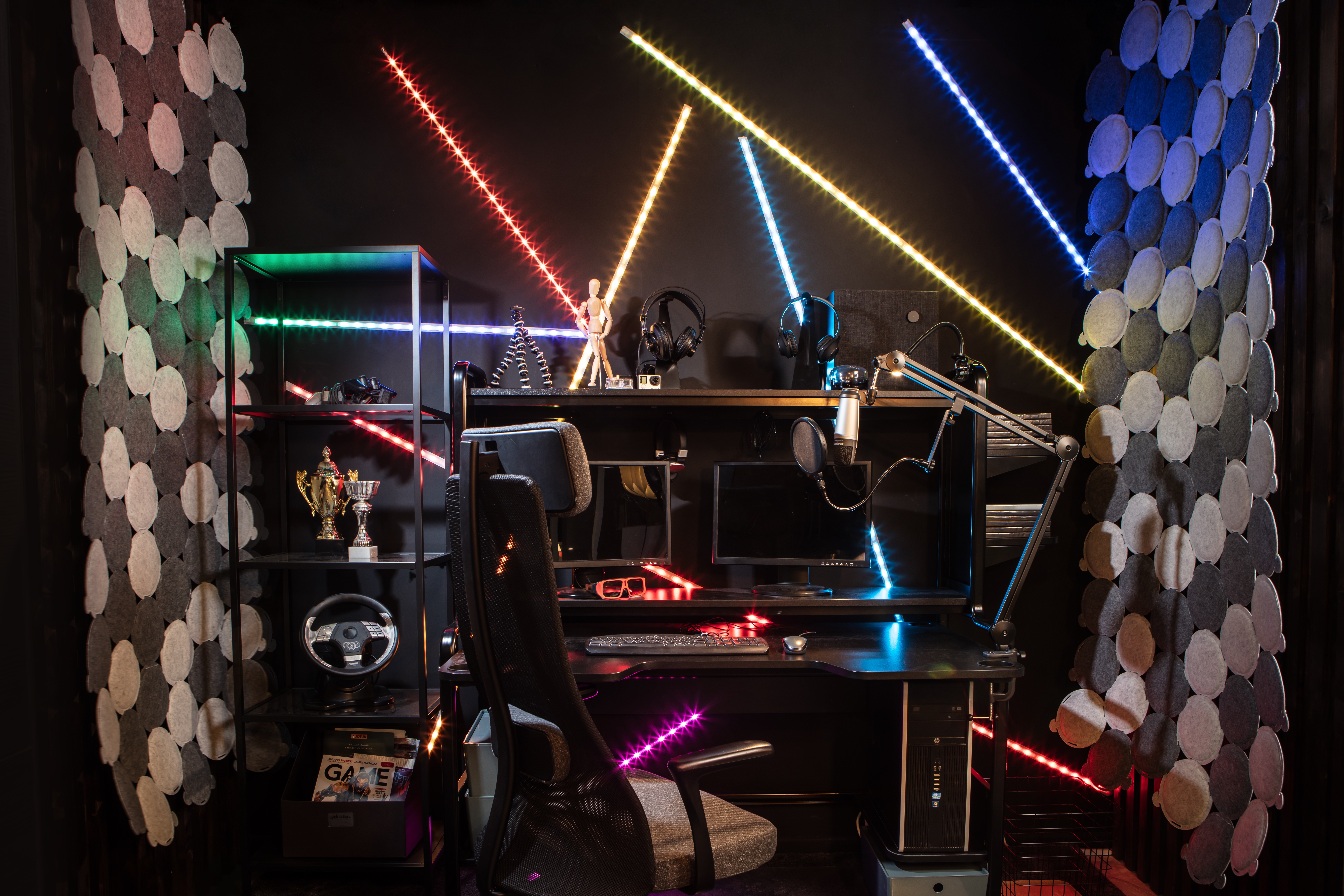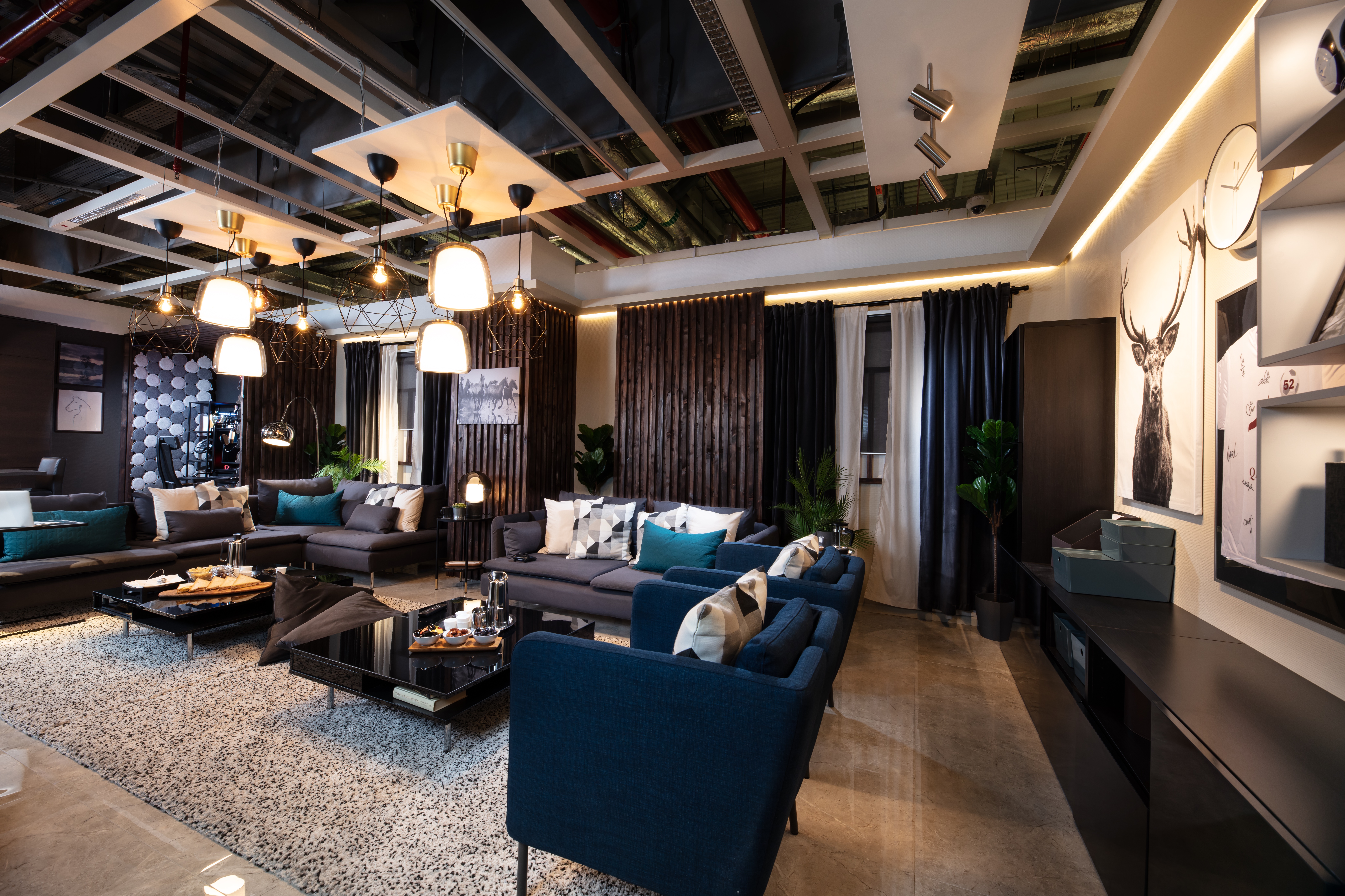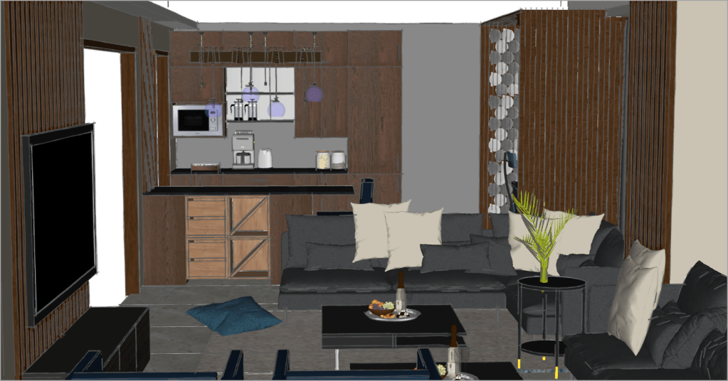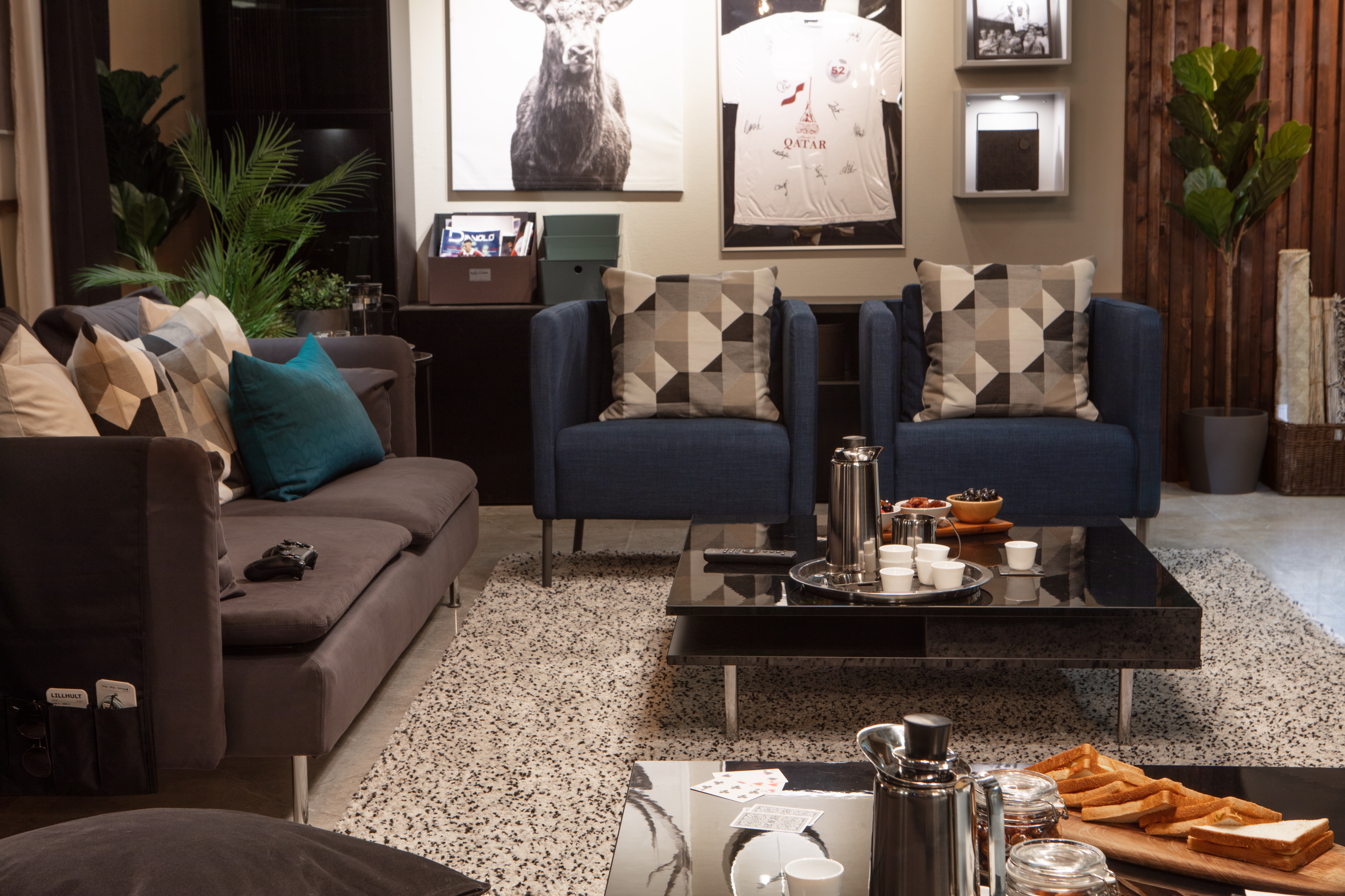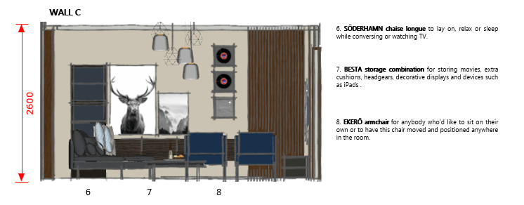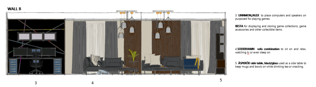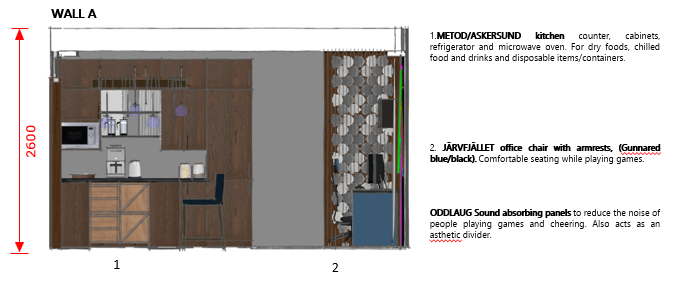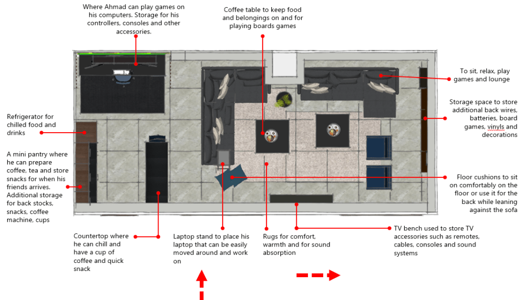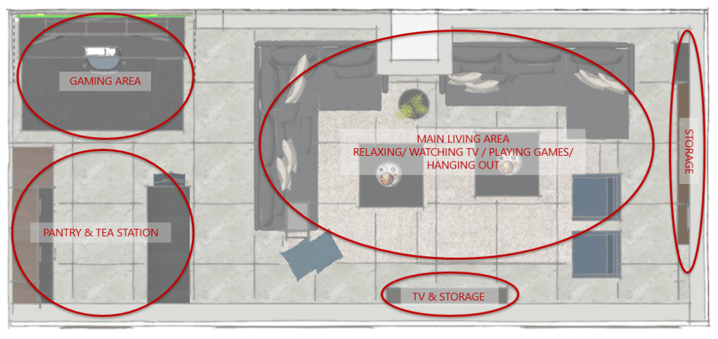The room contains an area each for lounging, gaming and a small pantry to store food and drinks.