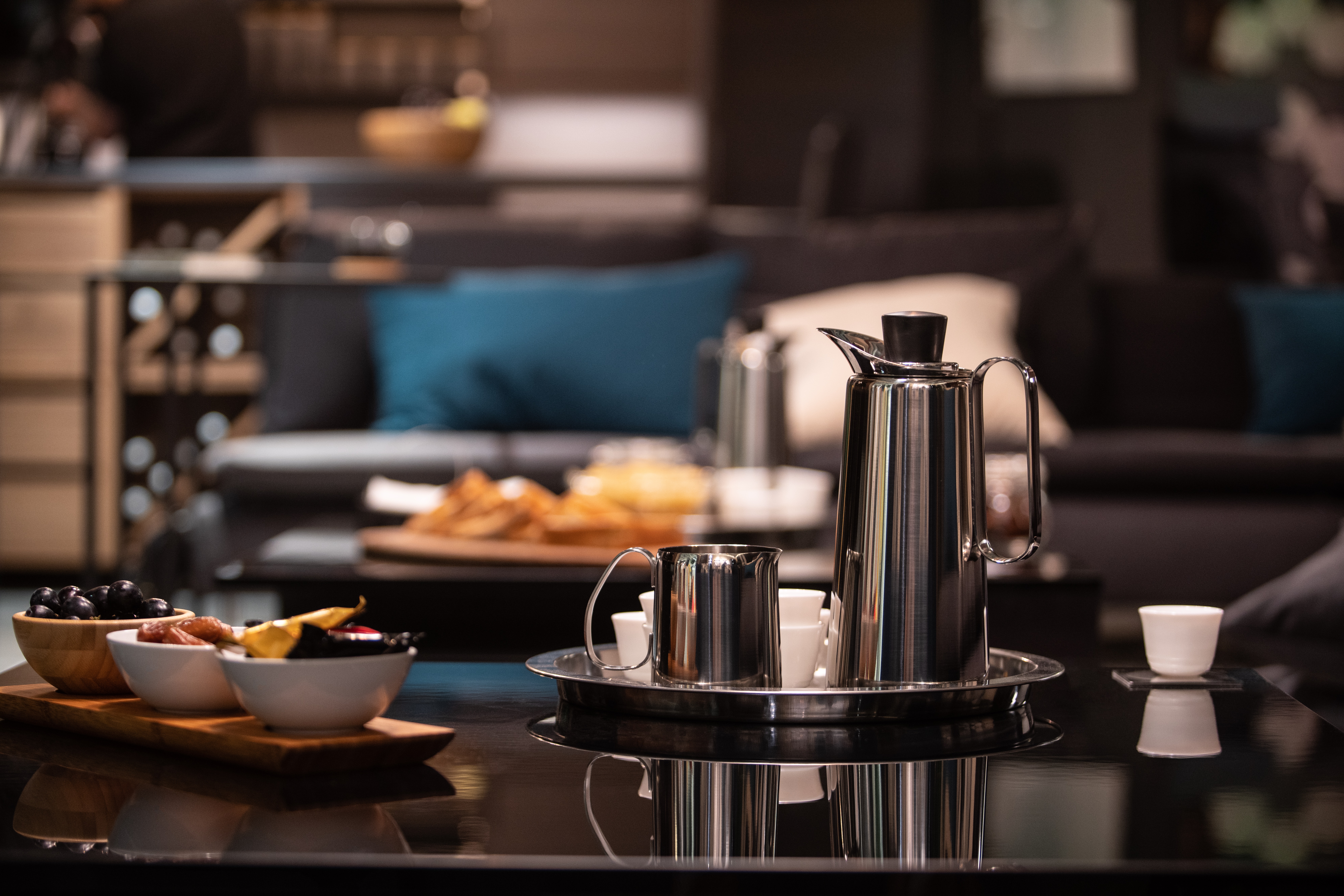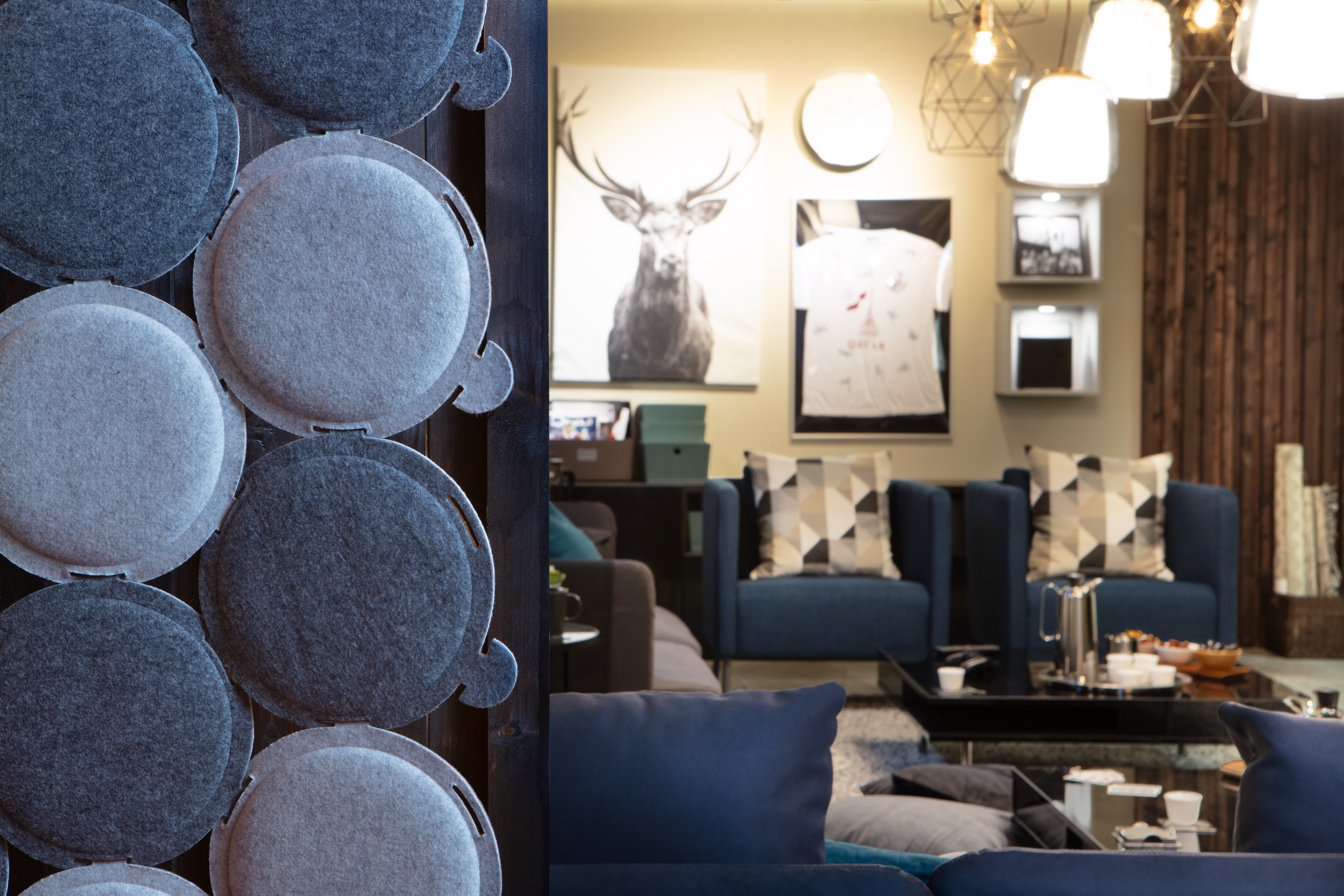 This room was designed around the environments of the two main groups of people who once occupied and grew into the young nation of Qatar; the pearl divers and the Bedouins (nomads). Hence, ‘land and sea’ became the concept from which materials, forms and colors were adapted.