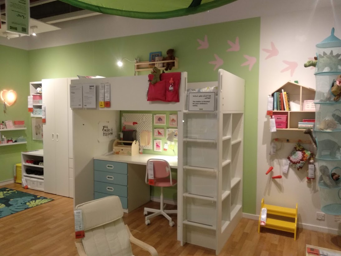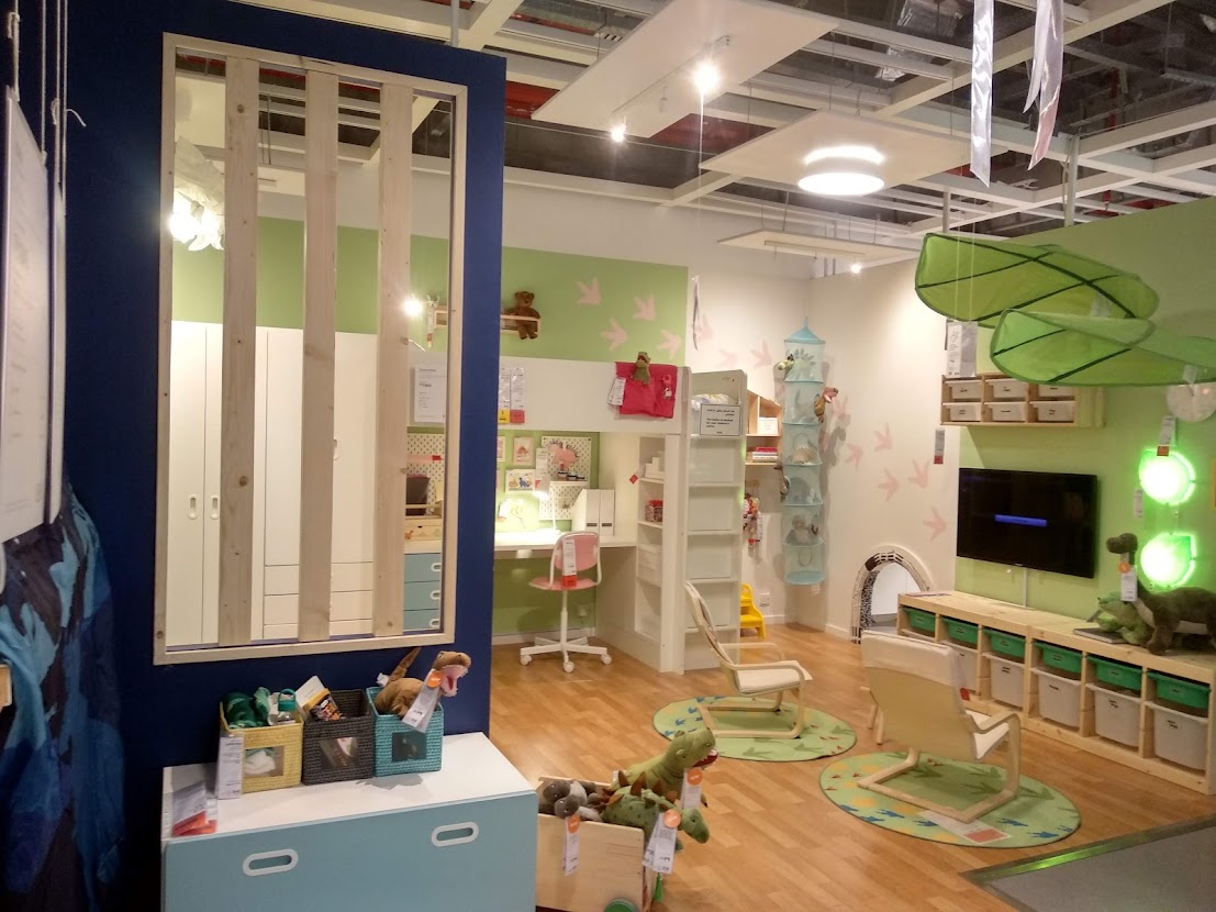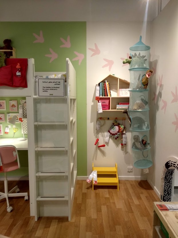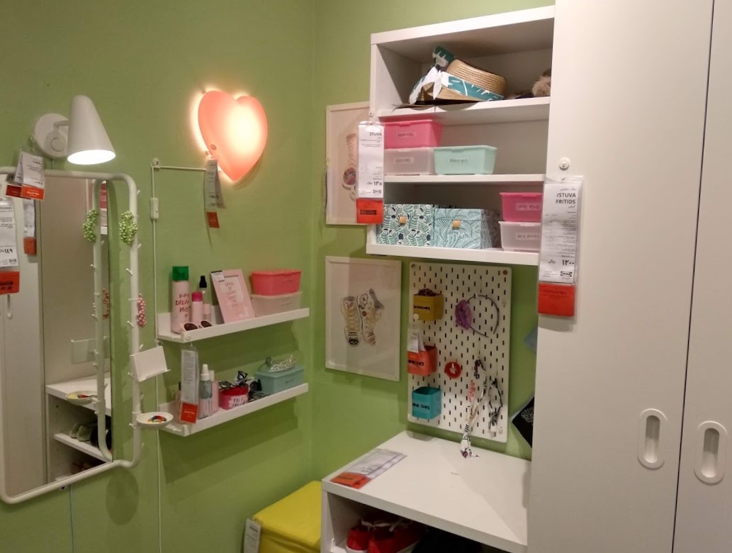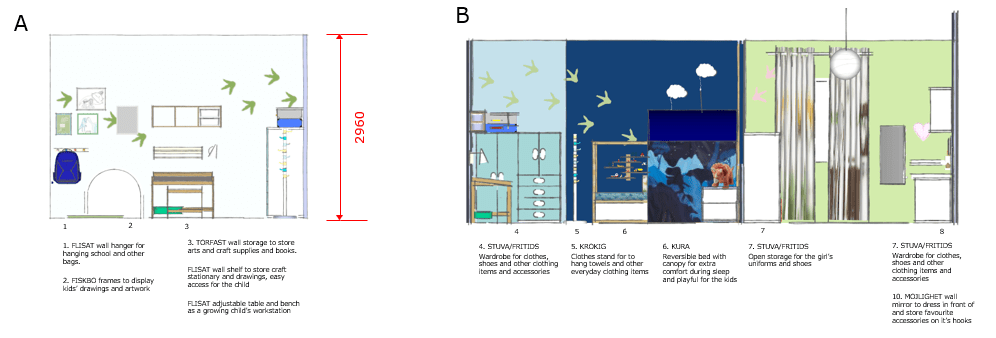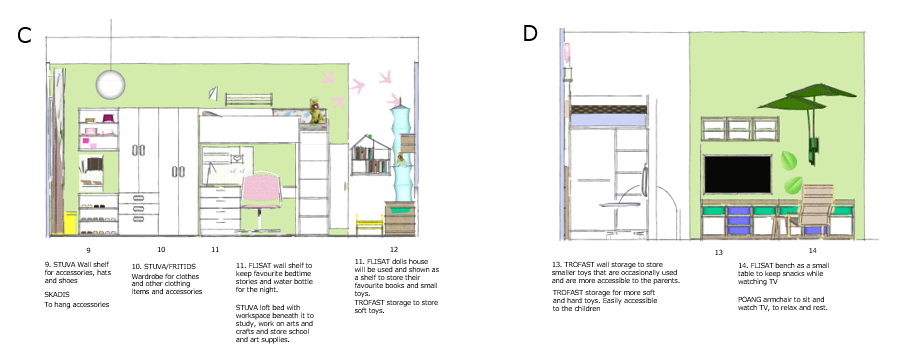 The colors chosen for this room is derived from the JATTELIK collection. Two distinct colors were also used to separate the two spaces. With the idea of representing ‘night and day’, a dark blue shade of paint was used for the toddler’s side of the room and a light green for the little girl. Each side is designed to suit their needs and height.
