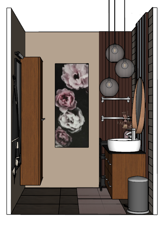 Modern looking, dark brown bathroom cabinets and washstands were used in this powder room with silver metal accessories. The wall on which the washbasins were attached to was tiled with beige wall tiles and dark grey floor tiles to match with the dark tones of the space. A light pink was used as an accent color.