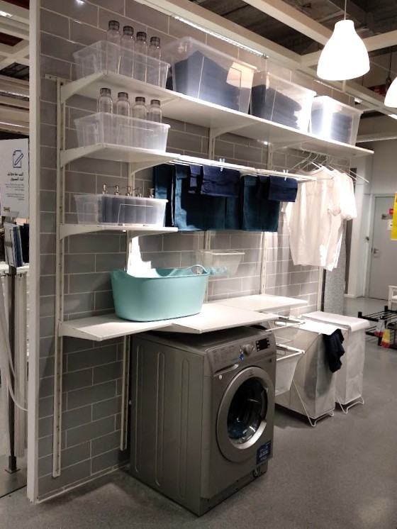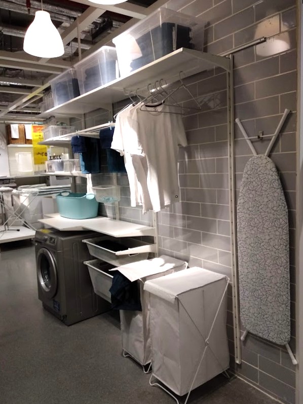 There are many good solutions that can be incorporated into a laundry room. This modular shelving unit make for a good solution as washing, drying, storing, collecting and ironing can be done in one place.